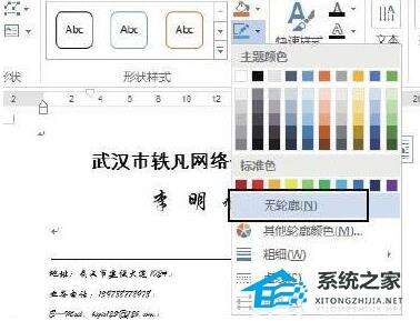 选择“无轮廓”选项 Word2013制作名片步骤5:取消对文本框的选择后,在“邮件”选项卡的“创建”组中单击“标签”按钮打开“信封和标签”对话框,单击“选项”按钮,如图5所示。