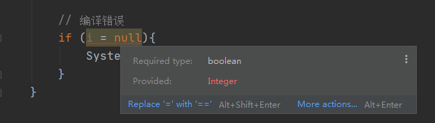 而在 Java 里面,if(xxx = null) 是有编译错误提示的: