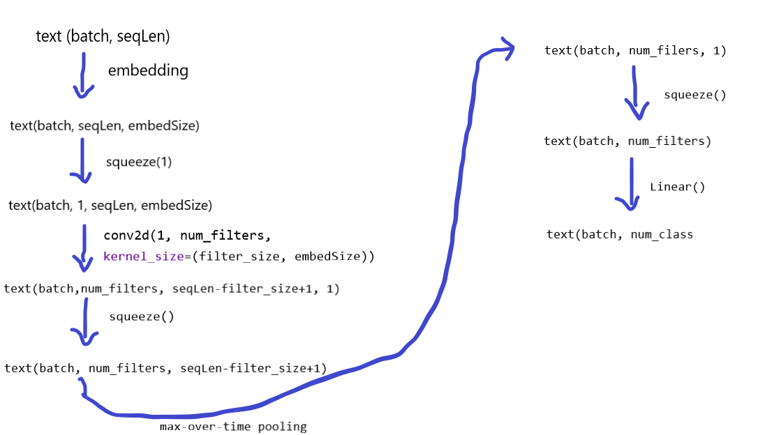 conved = F.relu(self.conv(embedded)) # conved.shape:(batchSize, num_filters, seqLen-filter_size+1, 1)