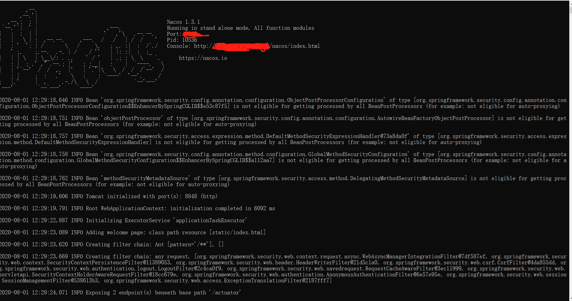 将nacos-server-1.3.1.tar.gz压缩包放到对应文件夹下执行 tar -xzvf nacos-server-1.3.1.tar.gz 命令解压。解压之后进入/nacos/bin文件夹下执行 sh startup.sh -m standalone (如果使用的是ubuntu系统的话可以使用 bash startup.sh -m standalone ) 单机模式启动Nacos即可,这里单机模式下不要使用 sh startup.sh 命令启动,不然会报错 。