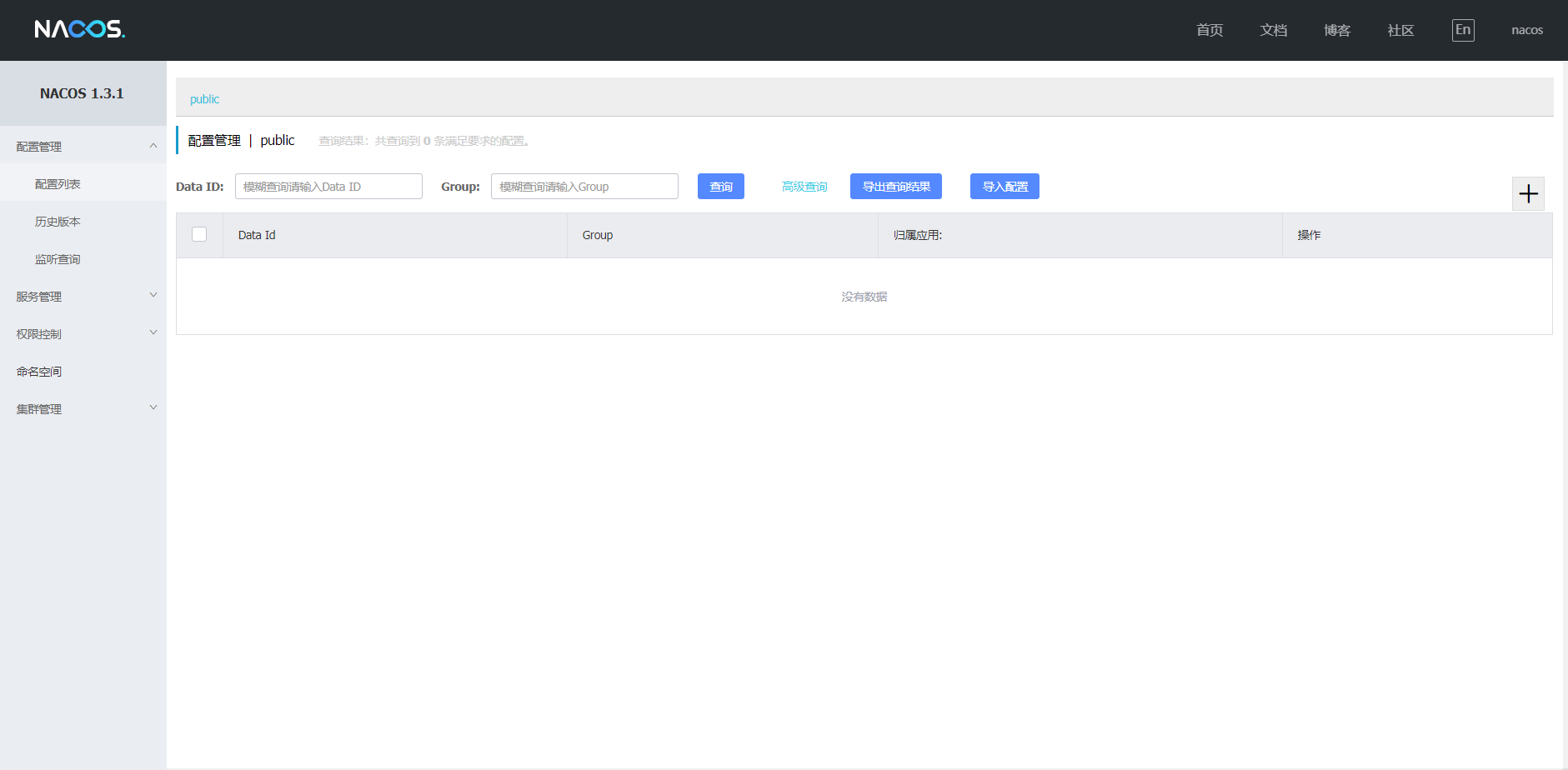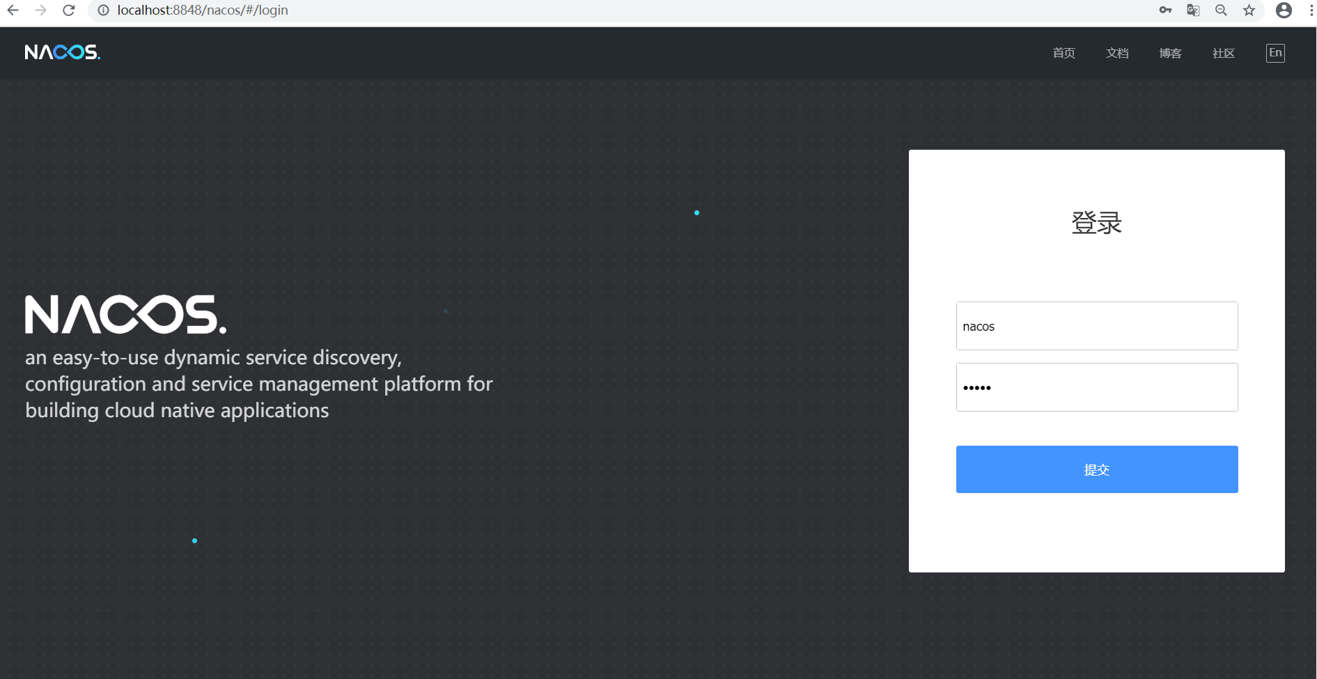搭建完成之后就可以在浏览器中访问Nacos,如果Nacos。默认配置情况下访问端口为8848,如果Nacos装在本地的话访问地址为 http://localhost:8848/nacos 。默认情况下用户名和密码都是nacos。