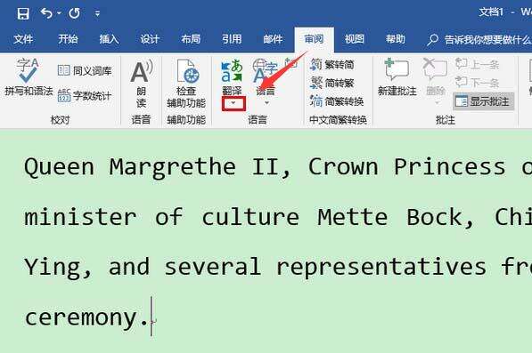 Word2019划词翻译在哪?审阅——翻译下边的向下箭头,选择“翻译所选内容”。