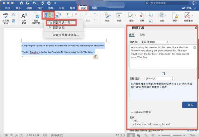 选择“插入”。 已翻译的文字将替换在步骤 1 中突出显示的文字。