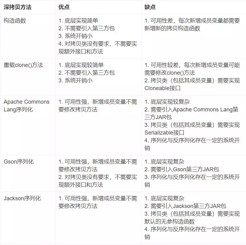 最简单的判断就是根据拷贝的类(包括其成员变量)是否提供了深拷贝的构造函数、是否实现了Cloneable接口、是否实现了Serializable接口、是否实现了默认的无参构造函数来进行选择。如果需要详细的考虑,则可以参考下面的表格: