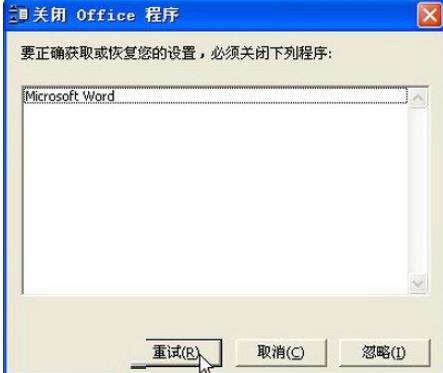 接下来系统将搜索正在运行的Office组件,如果发现有未关闭的Office组件,向导会提示用户必须关闭所有打开的Office组件才能正确获取或恢复设置。关闭正在运行的Office组件,然后在“关闭Office程序”对话框中单击“重试”按钮,如图所示。