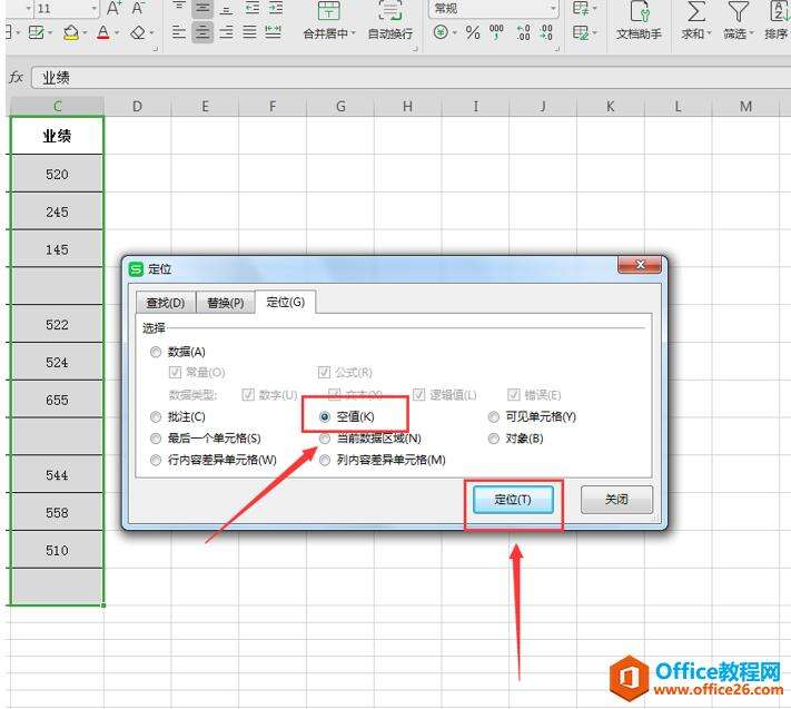 在弹出的定位面板,选择了【空值】填充,点击【定位】: