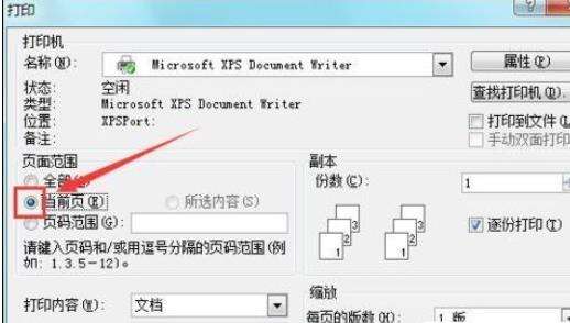 最后一步我们在页面范围的选项里找到当前页选项,勾选前面的单选按钮,点击确定,这样打印出的就是需要的了,如图所示: