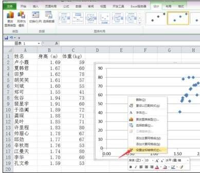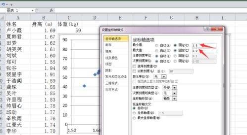 excel直接获得的散点图比较展示效果不太理想,需手动做一些调整。选择水平坐标轴,邮件,选择“设置坐标轴格式”,将坐标轴选项的最小值调整为1.5,最大值调整为2.0。同样的对纵轴也进行同样的设置,效果见下图。