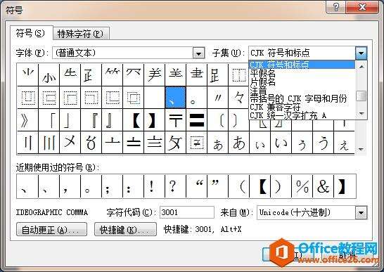 第二步:在『符号』对话框的『字体(F)』下拉框中选择『(普通文本)』,点击右侧的下拉框『子集(U)』,选择『CJK 符合和标点』;
