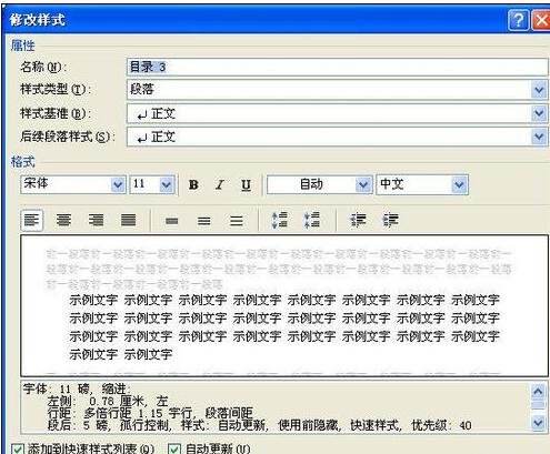 最后我们单击“修改”按钮,打开“修改样式”对话框,根据实际需要进行设置,单击“确定”按钮,如图所示,即可显示出新的目录样式。