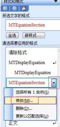 2.找到MTEquationSection,点右边下拉箭头“修改样式”(或者选中章节号域代码会自动跳到相应的样式)。