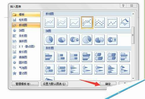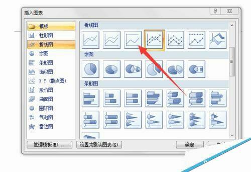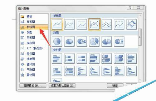 4、弹出一个图标的选择框,选择菜单中的【折线图】按钮,如图所示