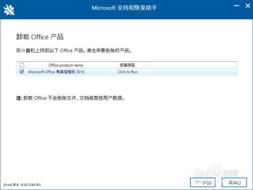 这里,我们选择需要卸载的office产品,我这里卸载的是office 2016 专业版 把这个前面的框勾选起来,点击下一步