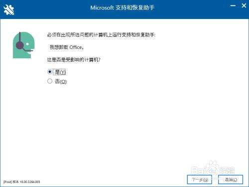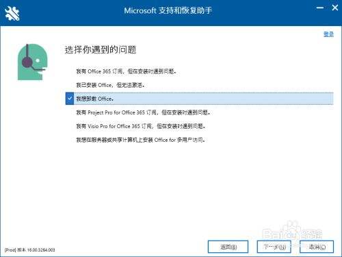 然后在下一步的时候默认选择的是第一个,这里我们需要切换下 选择第三个 “我想卸载office”,然后下一步