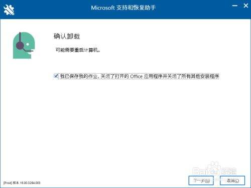 到了下面这个页面,需要确认下自己电脑上的Office文档(或者其它文档)是否处于打开状态,如果有打开状态的文档,先保存一下并关闭,防止卸载过程中文档损坏数据丢失,确认所有office文档(或者其它文档)已经保存并关闭,勾选这个方框,然后下一步(因为后面需要重启,所以最好把所有应用都关闭)