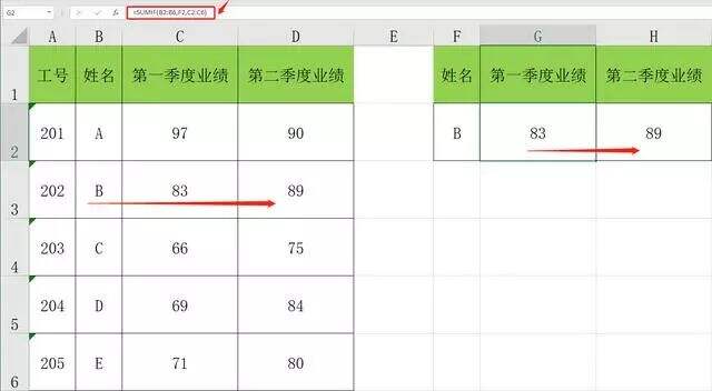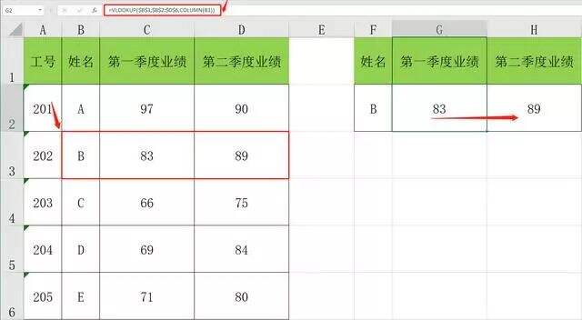 メ最后,一对多查询,根据姓名查询两季度值。G2输入函数:=VLOOKUP($B$3,$B$2:$D$6,COLUMN(B1))然后往右复制,函数比较复制。メ