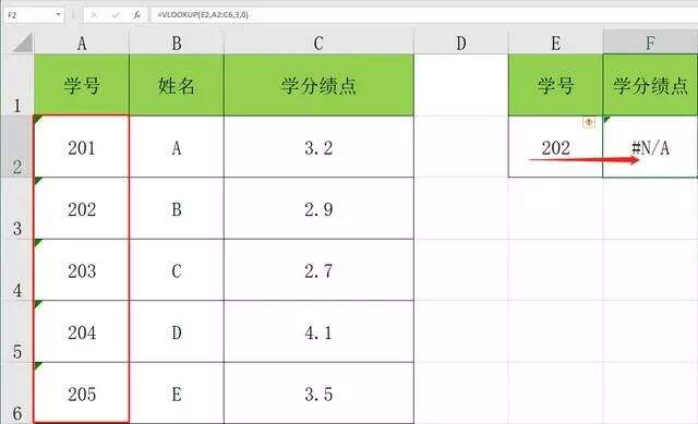 メ下表根据【文本:学号202】查询学分绩点,输入函数:=VLOOKUP(E2,A2:C6,3,0)查询出错,因为文本数据不能这样查询。メ