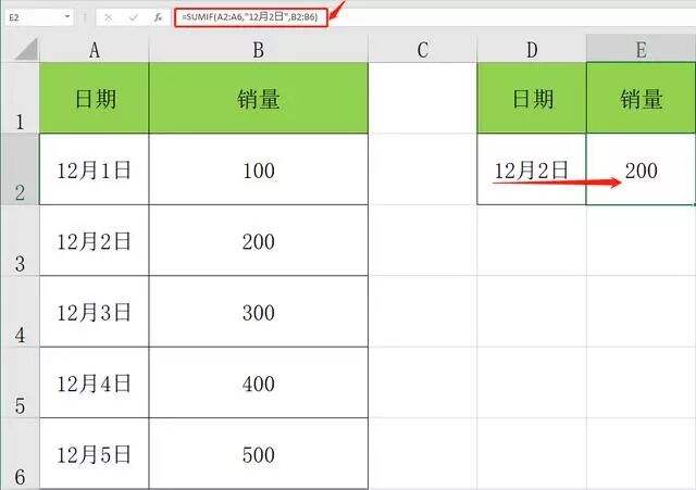 メ我们用SUMIF函数,输入函数:=SUMIF(A2:A6,”12月2日”,B2:B6)就可以直接查询。メ