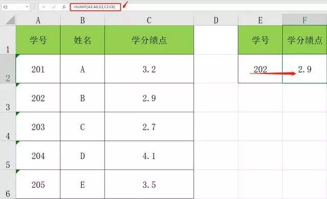 メ我们试着用SUMIF函数,输入函数:=SUMIF(B2:B6,F2,C2:C6),直接快手查询。メ