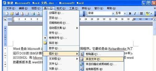然后我们单击菜单栏的“插入”,出来的菜单单击“图片”,在下一级菜单单击“来自文件”命令