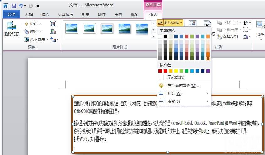 当图片被添加到文档后你可以通过“图片工具”来对图片进行简单的处理,你可以设置一下边框的大小,颜色,可以给图片添加阴影效果来使得图片与文本更加和谐统一.