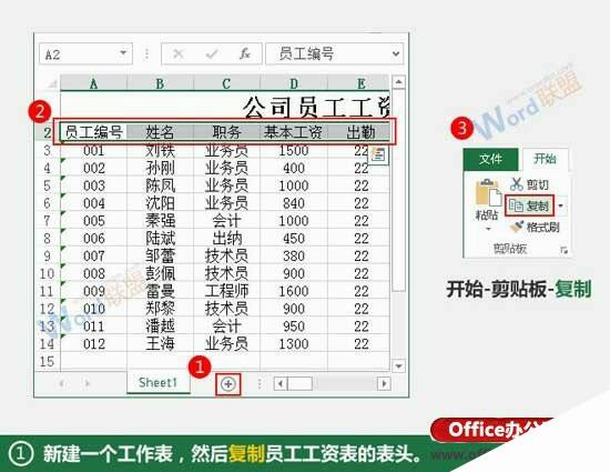 2、切换到新建的Sheet2工作表,选中A1单元格,然后粘贴复制来的工资表表头。