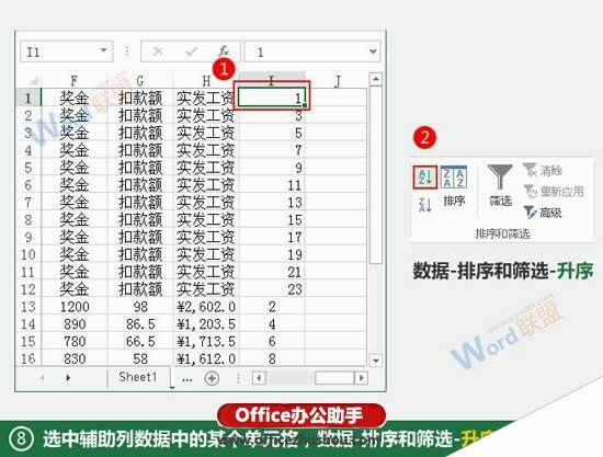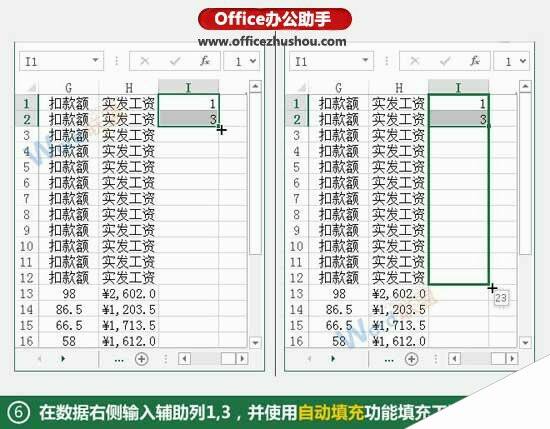 6、在所有工资表的表头右侧添加辅助数据序列,是以1开头的奇数序列。