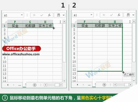 3、鼠标移动到粘贴的那行单元格的右下角,待指针变成黑色实心十字型时按下鼠标左键并向下拖动,到与工资表中所含员工数量相同的行号时释放鼠标。