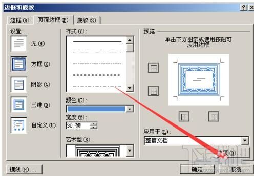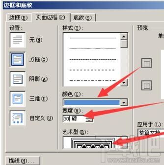点击 页面边框,单击艺术字,选择一个你喜欢的类型,颜色设为深蓝色,数值框为30磅