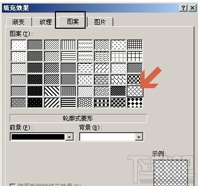 打开“图案”选项卡中的“轮廓式棱形”点击“页面边距”,在对话框中,单机“艺术字”下拉按钮,选择其中的一种边框,并且选择”白色,背景1,深色25%“