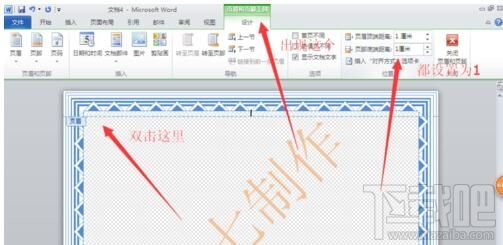 双击文档最顶端,在激活的“页眉和页脚工具 设计”,将“页眉顶端距离”,“页脚底端距离”的数值框的值设置为“1cm”