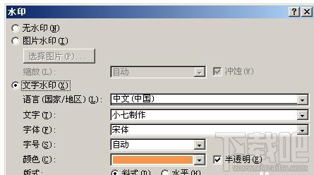 点击“水印”然后选择“自定义水印”,然后在对话框中选择文字水印,选择要输入的字,这里我以“小七制作”为例,颜色设为橙色