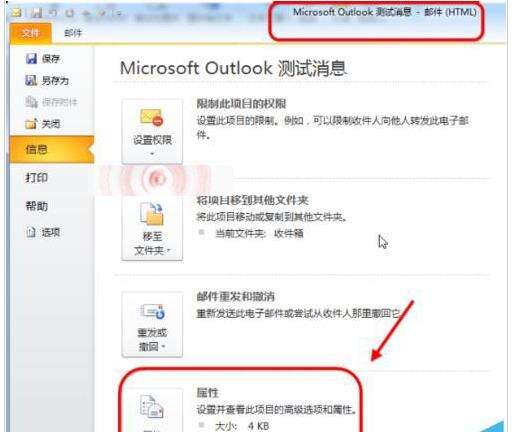 2、注意看下这里是邮件的属性,不是outlook的属性。【显示邮件的标题,最下方的属性】