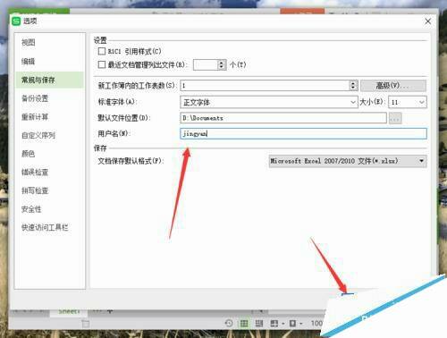 6、在“常规与保存”选项的右侧窗格中,找到“设置”组中的“用户名”选项,并将其名称进行修改,然后再点击“确定”按钮即可。如图所示;