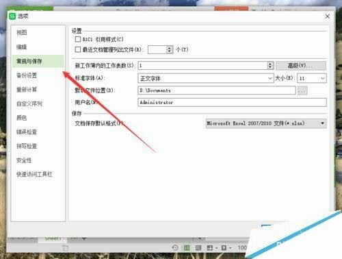 5、在“选项”对话框中,选择左侧窗格的“常规与保存”选项并点击它。如图所示;
