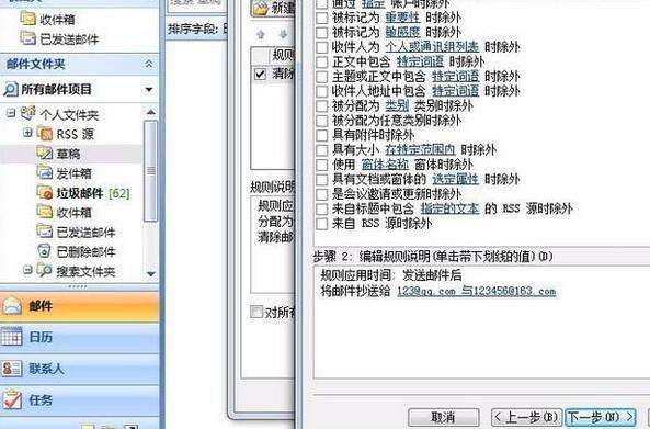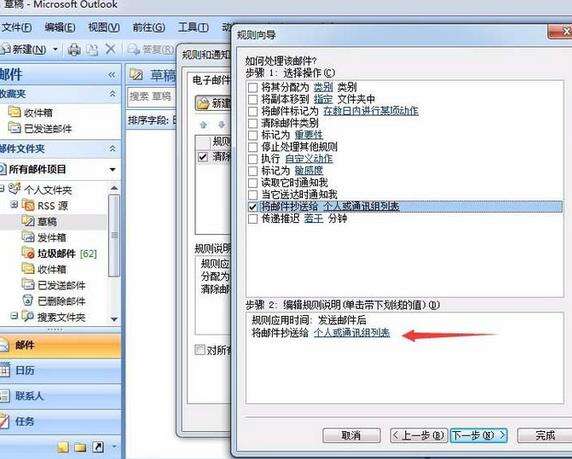 这一步选择将邮件抄送给个人或通讯组列表,在下方标箭头的地方设置你要抄送的人的邮箱账户,账户可以填多个。点击确定,下一步。