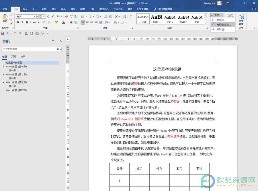 第一步:打开Word文档,在“开始”选项卡下点击“查找”按钮并在其子选项中点击“高级查找”;