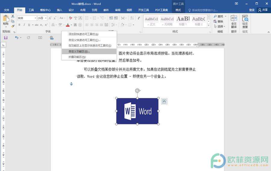 第一步:打开Word文档,选中需要进行设置的图片,鼠标右键点击功能区任意位置,在打开的选项中点击“自定义功能区”;