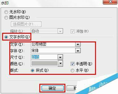 在打开的对话框中,选择文字水印,文字框里输入“公司绝密”(内容根据自己的情况进行编写),字体、尺寸、颜色、板式随自己意愿设置,其中尺寸可以点击下拉菜单选择,也可以选择自动(小诚推荐使用自动,可以刚好覆盖整个页面)