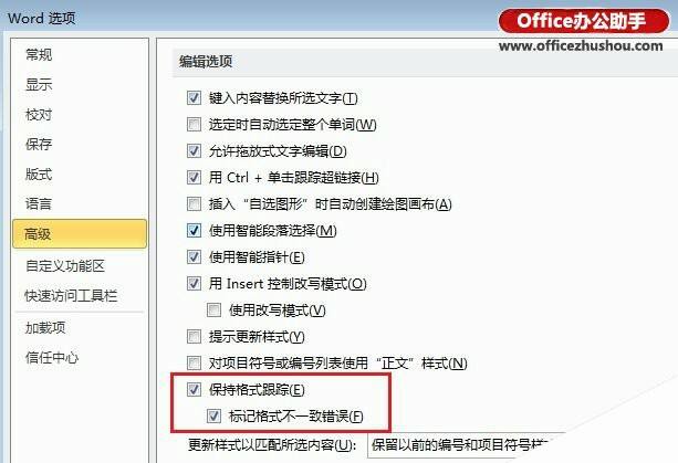 2、打开“Word选项”对话框,切换到“高级”选项卡。在“编辑选项”区域选中“保持格式跟踪”复选框,并同时选中“标记格式不一致错误”复选框即可,如图2所示。