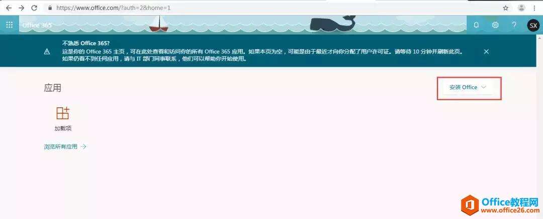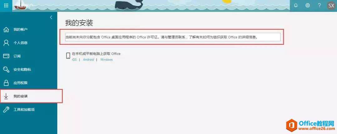 3、跳转到“我的安装”。显示当前尚未向你分配包含Office桌面应用程序的Office许可证。请与管理员联系,了解有关如何为组织获取Office的详细信息。说明外企业的Office管理者还没有给新员工分配Office权限。