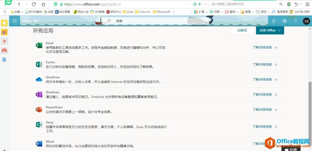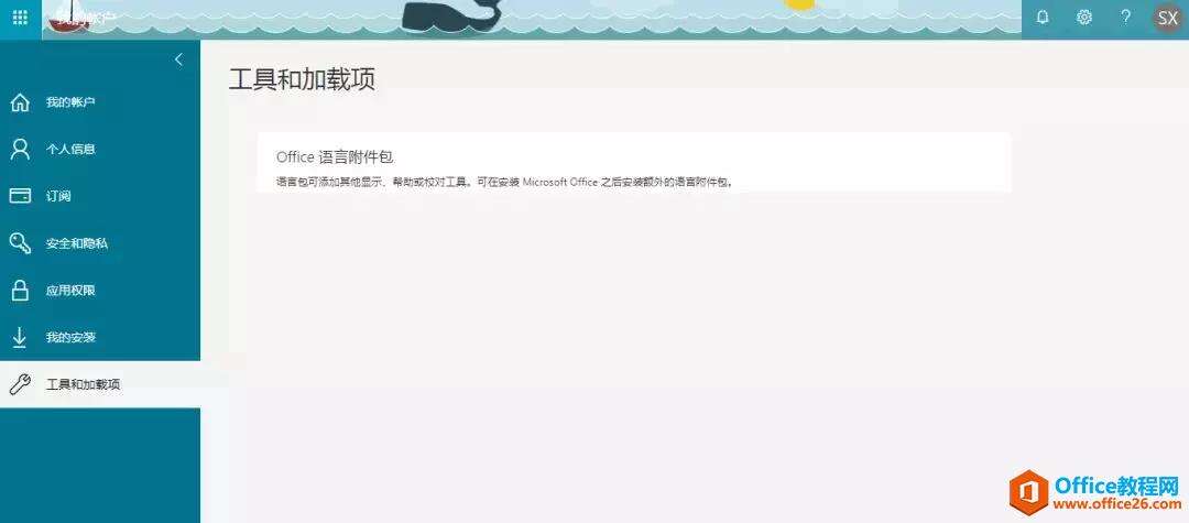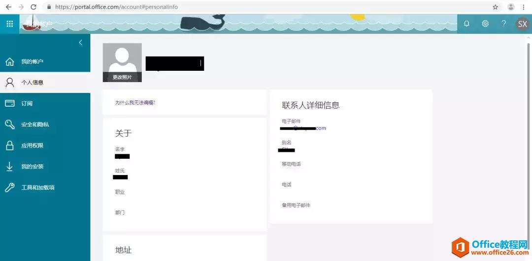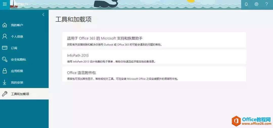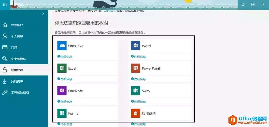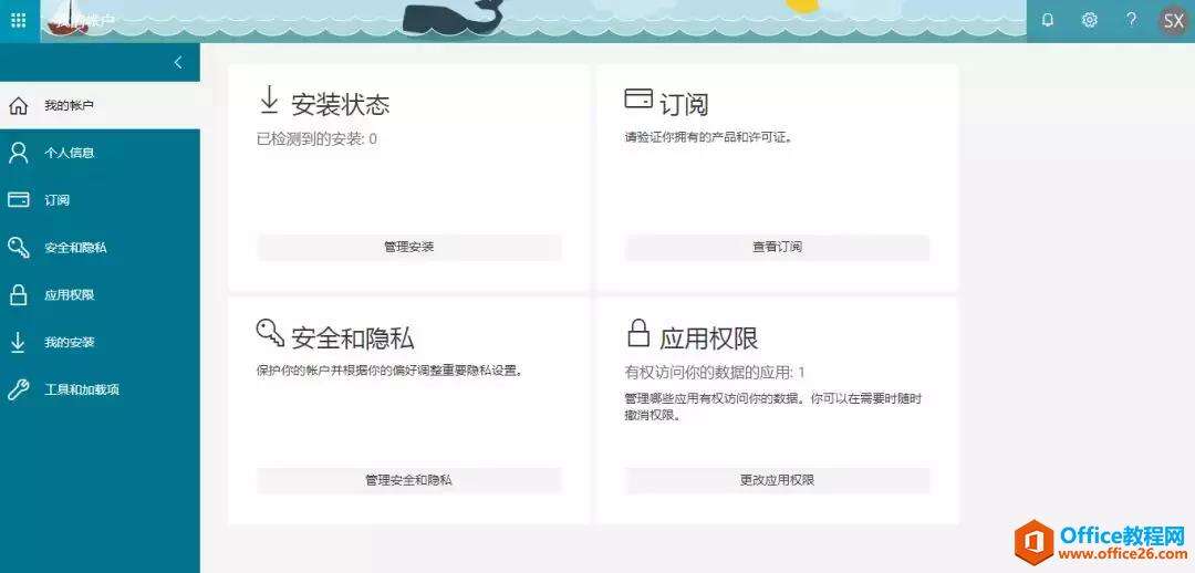 4、在“我的帐户”中,可以看到安装状态,已检测到的安装0,没有权限,也说明此帐户下面没有Office 365安装。
