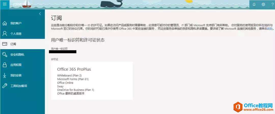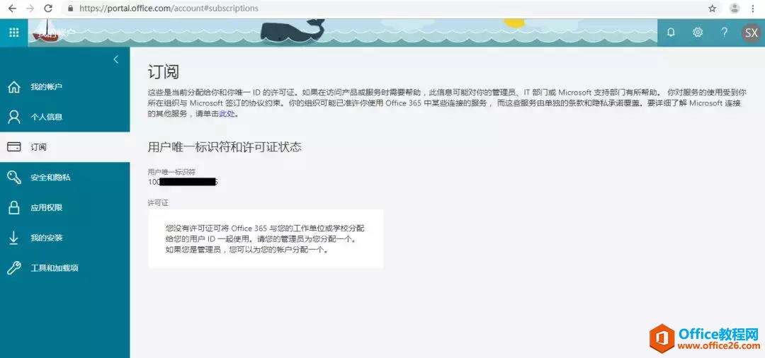 6、在“订阅”选面中,许可证,可以看到您没有许可证,可将Office365与您的工作单位或学校分配,给您的用户ID一起使用,请您的管理员为您分配一个。如果您是管理员,您可以为您的帐户分配一个。