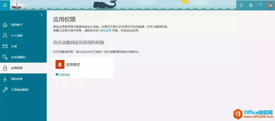 8、在“应用权限”中,有些应用权限是无法撤销的。一些应用的权限是管理员分配给你的,你无法撤销。