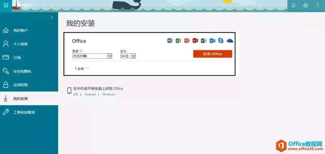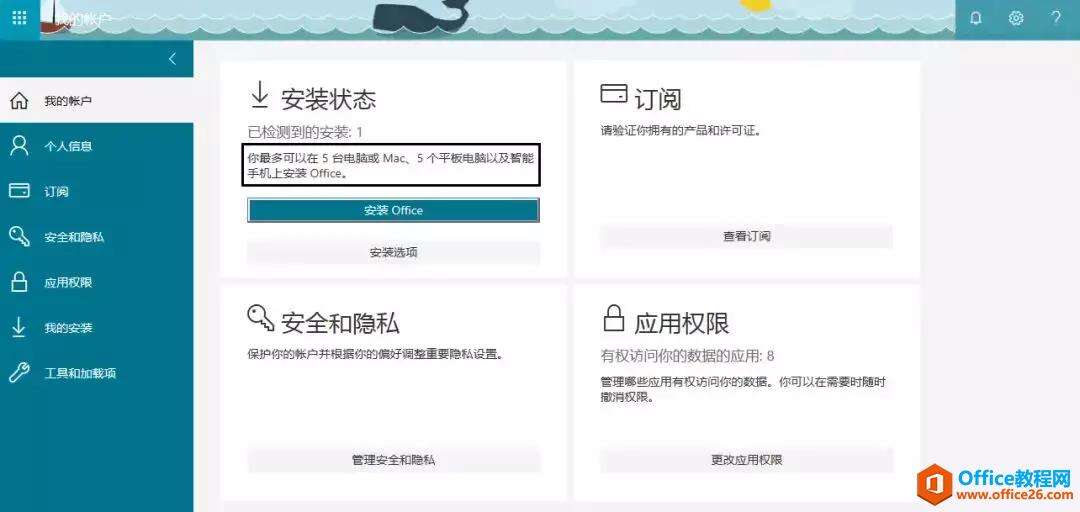 2、在“我的帐户”中,查看安装状态,你最多可以在5台电脑或者Mac、5个平板电脑以及智能手机上安装Office。此帐户可以有5个终端设备可以使用此帐户授权。