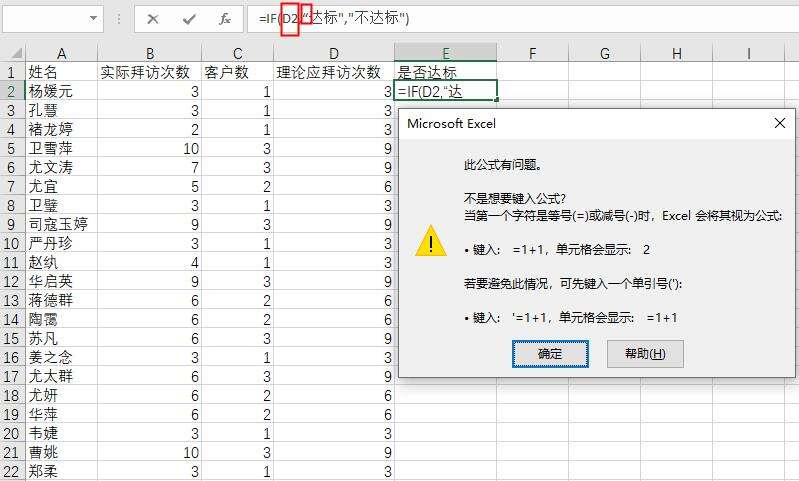 实际拜访次数是否达到理论应拜访次数,如果达到了在E列显示“达标”,否则,显示“不达标”,如下图: