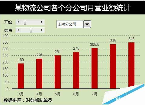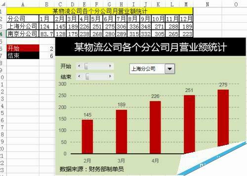 2、如图所示,通过滚动条控件来控制X轴的数据(月份)——上海分公司的数据——南京分公司的数据,通过组合窗体控件来控制公司名称。