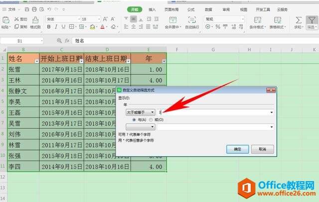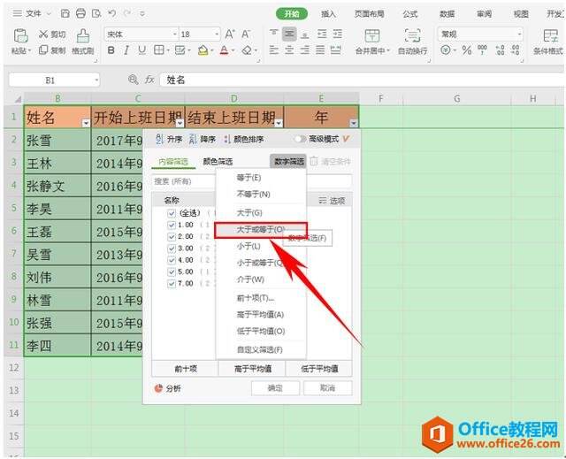 如下图我们需要筛选工作年限3年以上的人员。单击年列的下拉菜单,选择数字筛选,单击大于或等于。