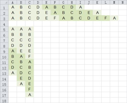 使用ROW函数,可以在每行中生成连续的数字,并且可以通过MOD函数获得除以4的余数(因为每四个字母必须重复)。然后,CHAR函数将65加到余数上,可以生成A、B、C、D和其他字符。
