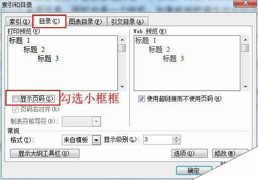4、插入——引用——索引和目录,在插入目录的设置对话框中,必须要勾选“显示页码”框。这样在插入目录之后就会在后面出现目录页码。(因为很多用户没有点击该小框框,所以word目录不显示页码)